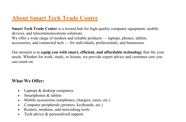Smart Tech Trade Center is a trusted hub for high-quality computer equipment, mobile devices, and telecommunications solutions. We offer a wide range of modern and reliable products — laptops, phones, tablets, accessories, and connected tech — for individuals, professionals, and businesses. Our mission is to equip you with smart, efficient, and affordable technology that fits your needs. Whether for work, study, or leisure, we provide expert advice and customer care you can count on.