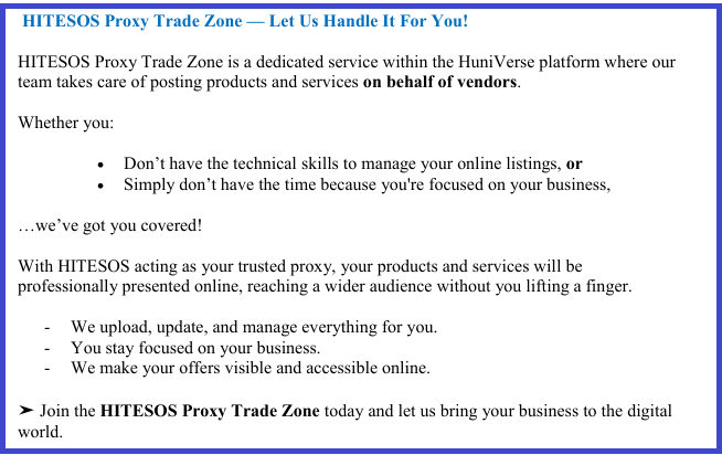 HITESOS Proxy Trade Zone is a dedicated service within the HuniVerse platform where our team takes care of posting products and services on behalf of vendors. Whether you: • Don’t have the technical skills to manage your online listings, or • Simply don’t have the time because you're focused on your business, …we’ve got you covered! With HITESOS acting as your trusted proxy, your products and services will be professionally presented online, reaching a wider audience without you lifting a finger. - We upload, update, and manage everything for you. - You stay focused on your business. - We make your offers visible and accessible online. ➤ Join the HITESOS Proxy Trade Zone today and let us bring your business to the digital world.